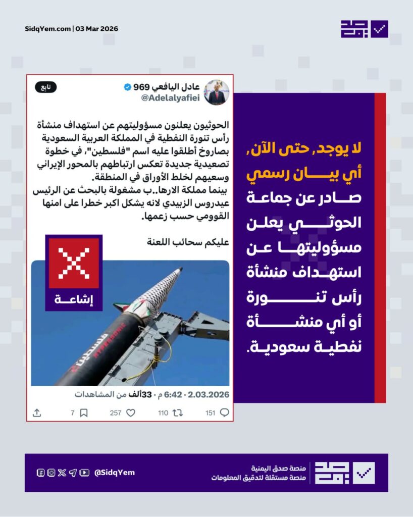 تداولت حسابات على منصة “إكس”، من أبرزها حساب باسم “عادل اليافعي 969“ وحسابات أخرى محسوبة على المجلس الانتقالي، رواية تزعم إعلان جماعة الحوثي مسؤوليتها عن استهداف منشأة رأس تنورة النفطية في السعودية باستخدام صاروخ أطلقوا عليه اسم “فلسطين”. كما حاولت هذه الحسابات ربط الحادثة بـ “انشغال” السعودية بملاحقة عيدروس الزبيدي.